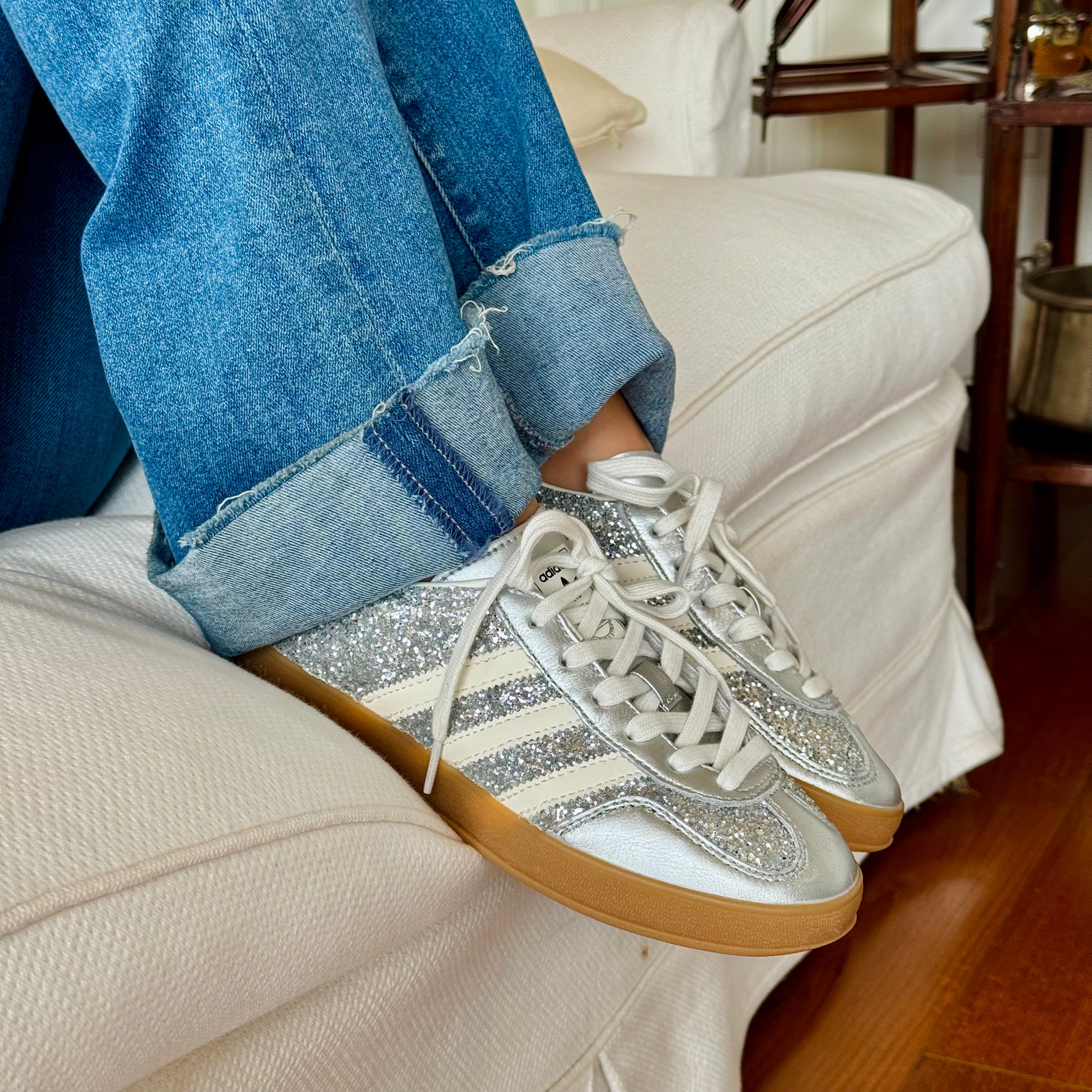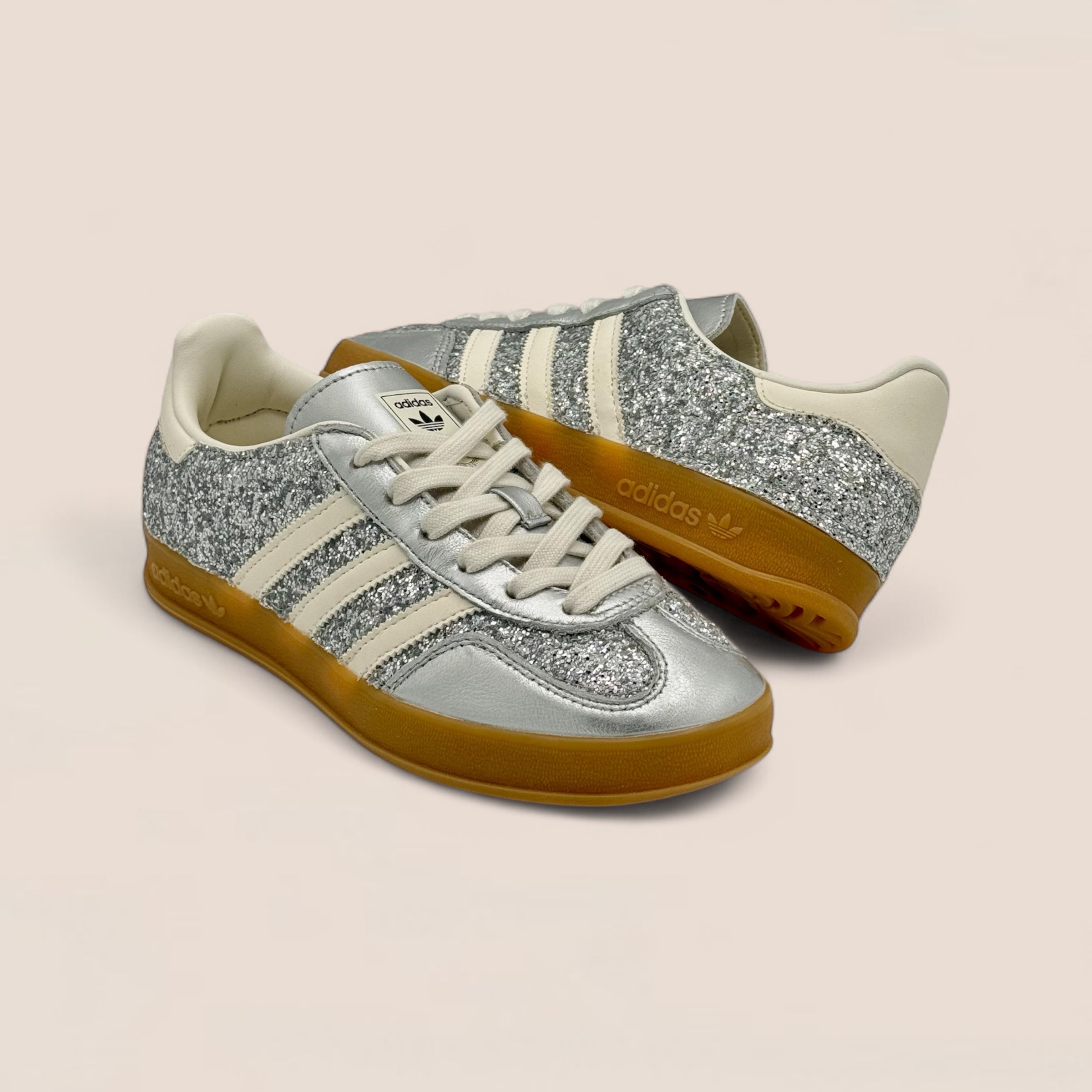 Nate come scarpe da training indoor, le adidas Gazelle sono diventate nel tempo un'icona intramontabile. Fedeli alla versione originale, queste sneakers sono personalizzate con glitter argento finemente cucito