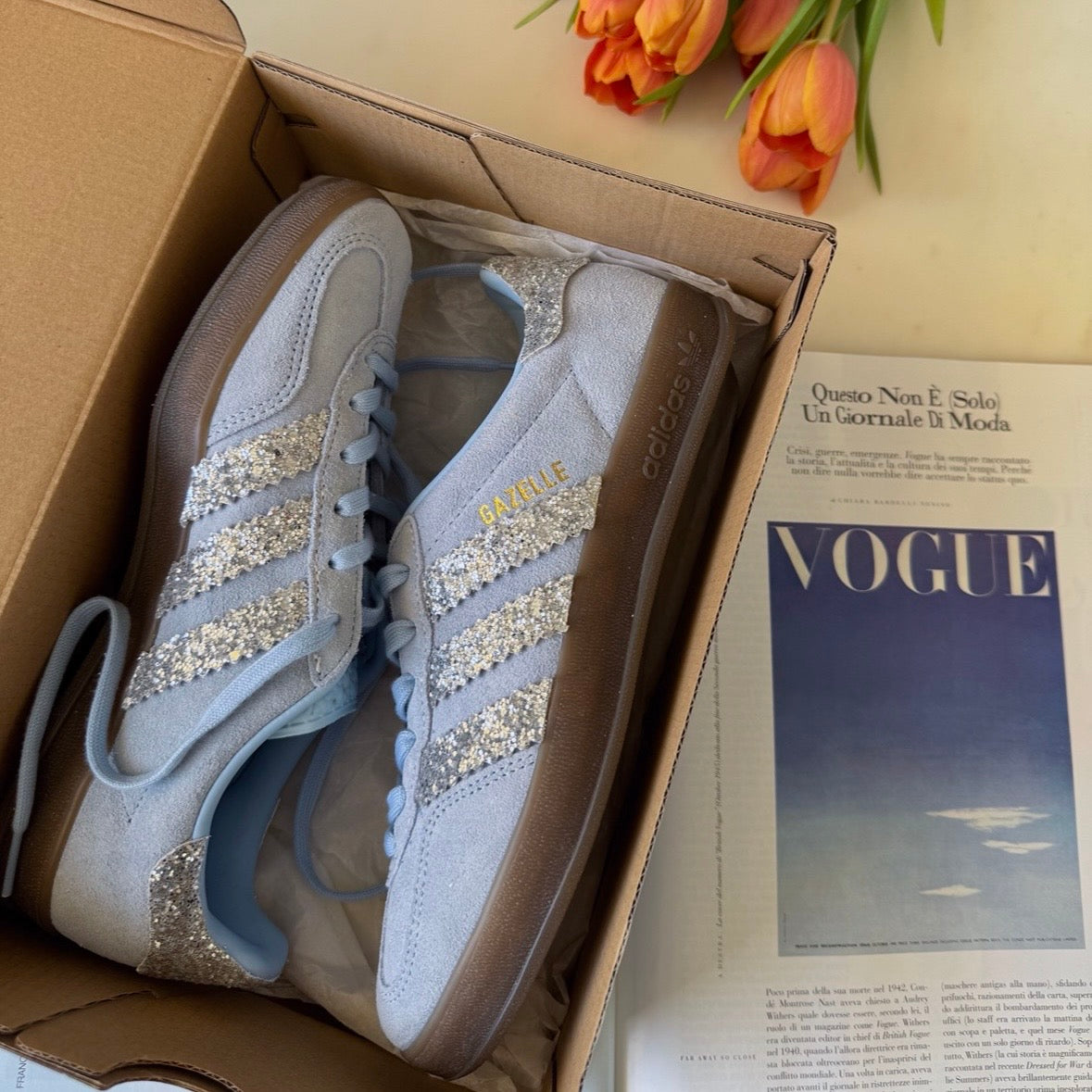 Nate come scarpe da training indoor, le adidas Gazelle sono diventate nel tempo un'icona intramontabile. Fedeli alla versione originale, queste sneakers sono personalizzate con un glitter argento finemente cucito.